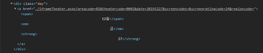 상영 스케줄은 위 처럼 되어있는데, 만들어 놓은 소스는 한 줄 씩 받아오기 때문에 "25</strong>"을 체크하기로 했다.
