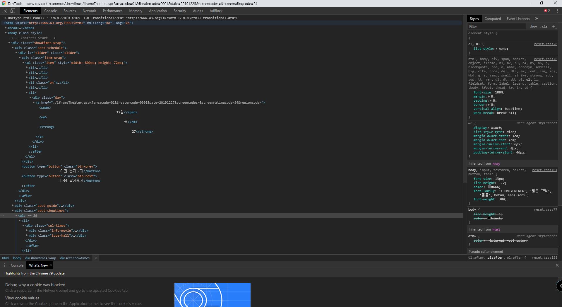 데이터를 쭉 읽어오다가 "sect-showtimes" div 블록을 통해 영화가 떴는지 안떴는지 확인할 수 있다.